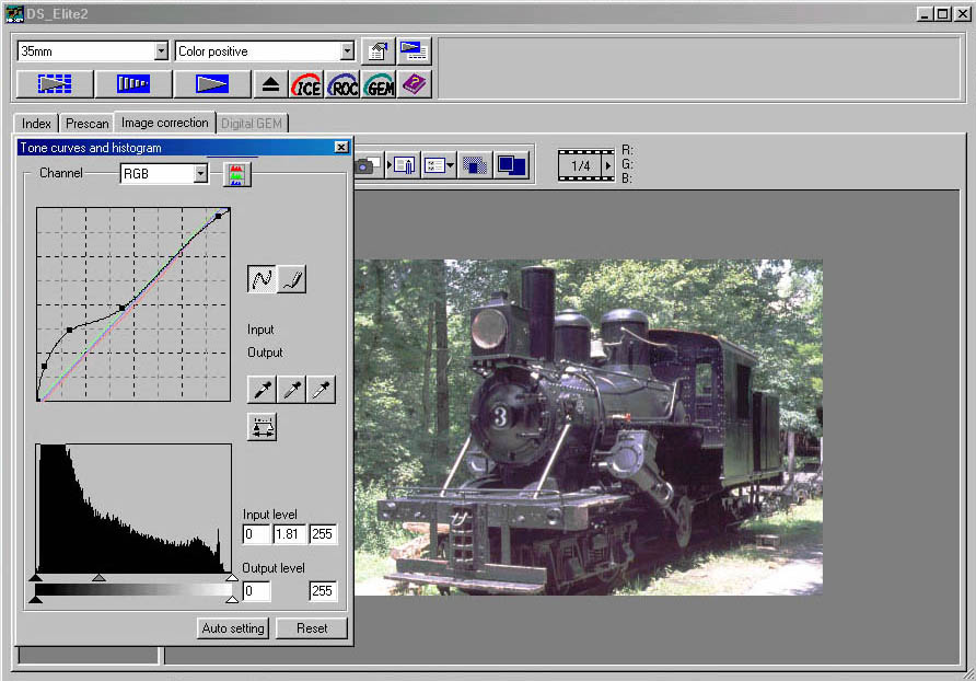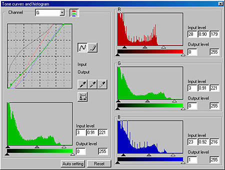 At the bottom of the window are the Auto Setting (which tells the software to analyze the histograms and make its best guess as to the proper correction) and Reset buttons.
