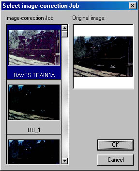 The Minolta Dimage Scan Elite II lets you save image correction settings as a "Job," so that you can apply the same settings to an entire group of images or any other image. Saved job files show up in the far left column of the Correction tab, with a scroll bar so that you can zip through various settings and determine the one you would like to apply.
