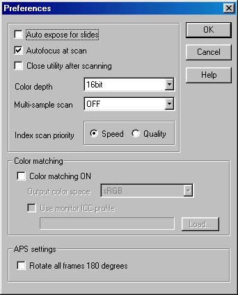 - Auto Expose for Slides: When activated, this tells the scanner to perform an autoexposure while prescanning color slides. This slows scanning somewhat because the scanner does a prescan to set exposure before the main scan.
