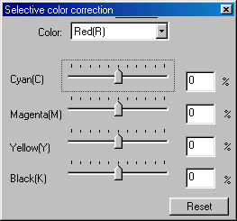Four slider bars adjust the amount of Cyan, Magenta, Yellow, and Black in each color, with the amount of adjustment reported at the end of the bar. This is the tricky part of this control, in that the adjustments are made in subtractive color space (CMYK), rather than the RGB additive color space most photographers and computer graphics users will be familiar with. The thing to keep in mind is that these colors are inverses of the ones you're familiar with. That is, adding cyan to an image is equivalent to removing red, adding magenta is the same as removing green, and adding yellow is the same as removing blue. Note that adding a subtractive color darkens the image, rather than lightening it as with the additive primary colors.