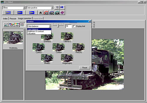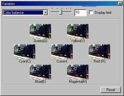 The Variations button pulls up the Variations correction window. This is perhaps the most "user friendly" adjustment control, ideal for people who are novices at image correction. Three separate displays are available, dealing with color cast, contrast & brightness, and color saturation. In each case, a number of small thumbnails appear onscreen, with the central image showing the effect of any currently-selected image adjustments, and the surrounding thumbnails showing a range of possible adjustments. If you decide you like one of the surrounding options better than the current selection, you choose that adjustment by simply clicking on the thumbnail image. It then becomes the central image, representing the current state of the correction, and you're presented with a new range of alternative choices. A slider bar next to the pulldown menu adjusts the amount of difference between each variation. The "Display Limit" checkbox activates an indicator of the maximum level for each adjustment.