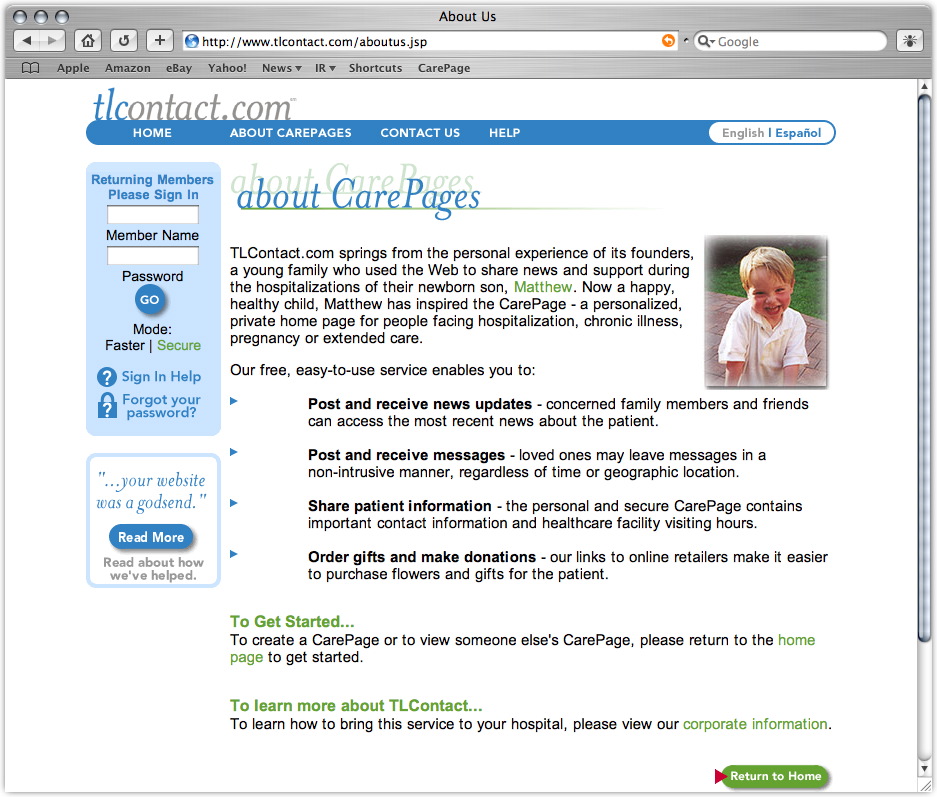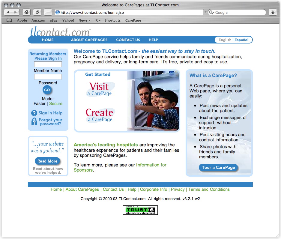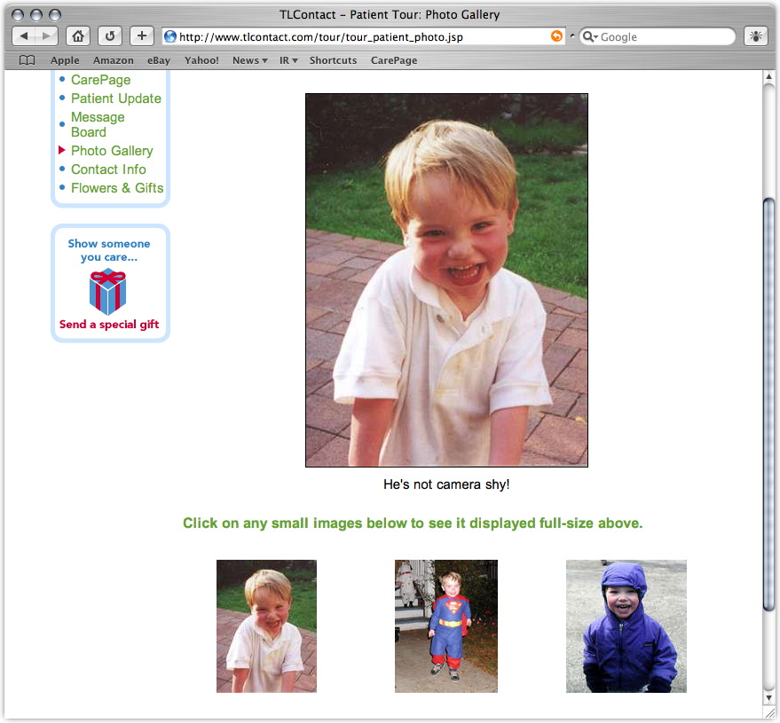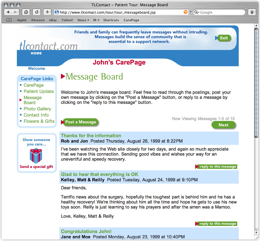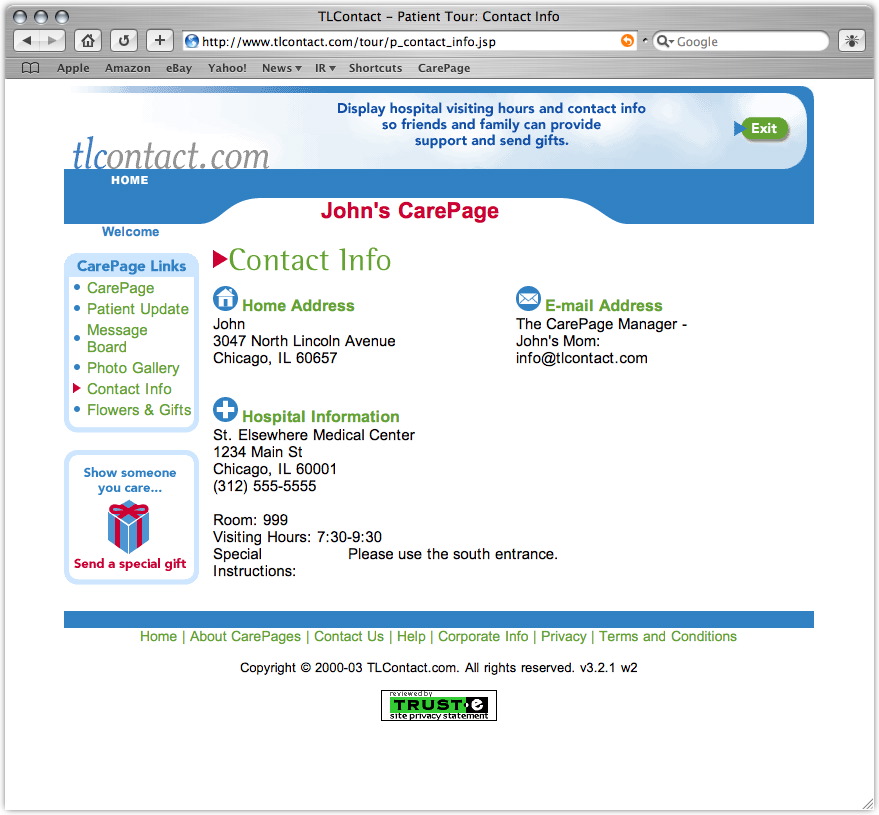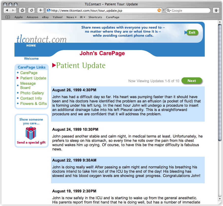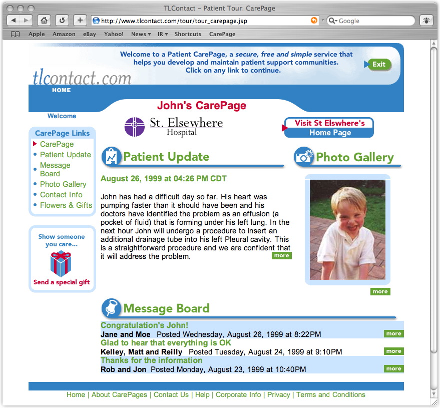 While he was getting comfortable in his new digs, we idly scanned the laminated brochure attached to his bedside table. On the back page we read an invitation from Chicago-based TLContact.com to set up a CarePage on their site devoted to our patient's progress -- at no charge.