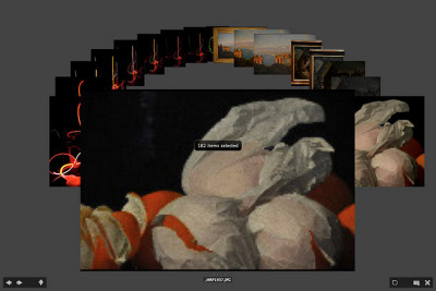 But it goes a lot further with the new Review Mode under the View menu. At first it turns any selection of images into what looks like Apple's Cover Flow. But it shows your selection in more context than Cover Flow, which is designed to show only one image at a time. You can quickly cycle through your images using the arrow keys (or swipe gestures on multitouch systems). The Down key removes an image from the selection, R takes you to Camera Raw and there is a Loupe tool to inspect detail.