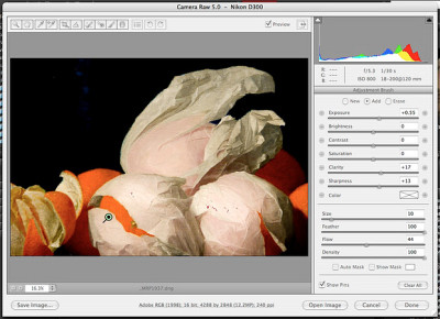 Using the new Adjustment Brush tool, you can set sliders for Exposure, Brightness, Contrast, Saturation, Clarity, Sharpness and Color. Then modify brush features like Size, Feather, Flow and Density. After you've painted over the image, a pin is displayed to mark the editable stroke. Hover over the pin and you'll see a mask of what's been affected. And the mask (via the brush controls) as well as the effect is editable.