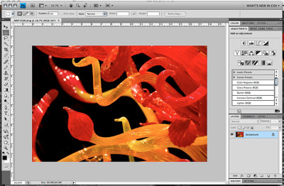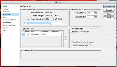 OpenGL. Photoshop now draws pixels on your screen through OpenGL. Hardware accelerated panning and zooming makes for a much smoother close-up inspection of your image if your GPU is up to the task. Even on a portable's GPU, memory management is a lot smoother. We didn't see that on our system, whose video card could not support OpenGL drawing, but we did at boot camp. Even color correction is being done by the GPU now.