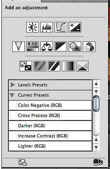Many of these also include presets. The Curves adjustment, for example, includes presets for Color Negative, Cross Process, Darker, Increase Contrast, Lighter, Linear Contrast, Medium Contrast, Negative and Strong Contrast. Select a preset and the Curve tool will reshape itself automatically modifying the image's tone and color with a new adjustment layer.