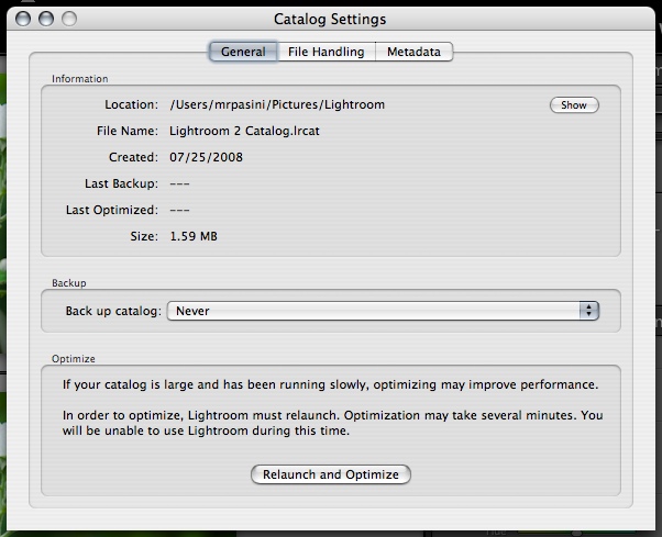 General preferences take you to the new Catalog Settings. Those settings include options for catalog location, backup behavior and catalog optimization to improve performance in its own General pane. The File Handling pane sets preview size and quality as well as when to discard 1:1 previews, plus import sequence numbers. Finally the Metadata pane enables the new suggestion behavior and clears suggestion lists, enables storing edits in metadata for file formats other than DNG and enables automatically writing changes into XMP sidecards. You an also direct Lightroom 2 to write date or time changes into Raw files.