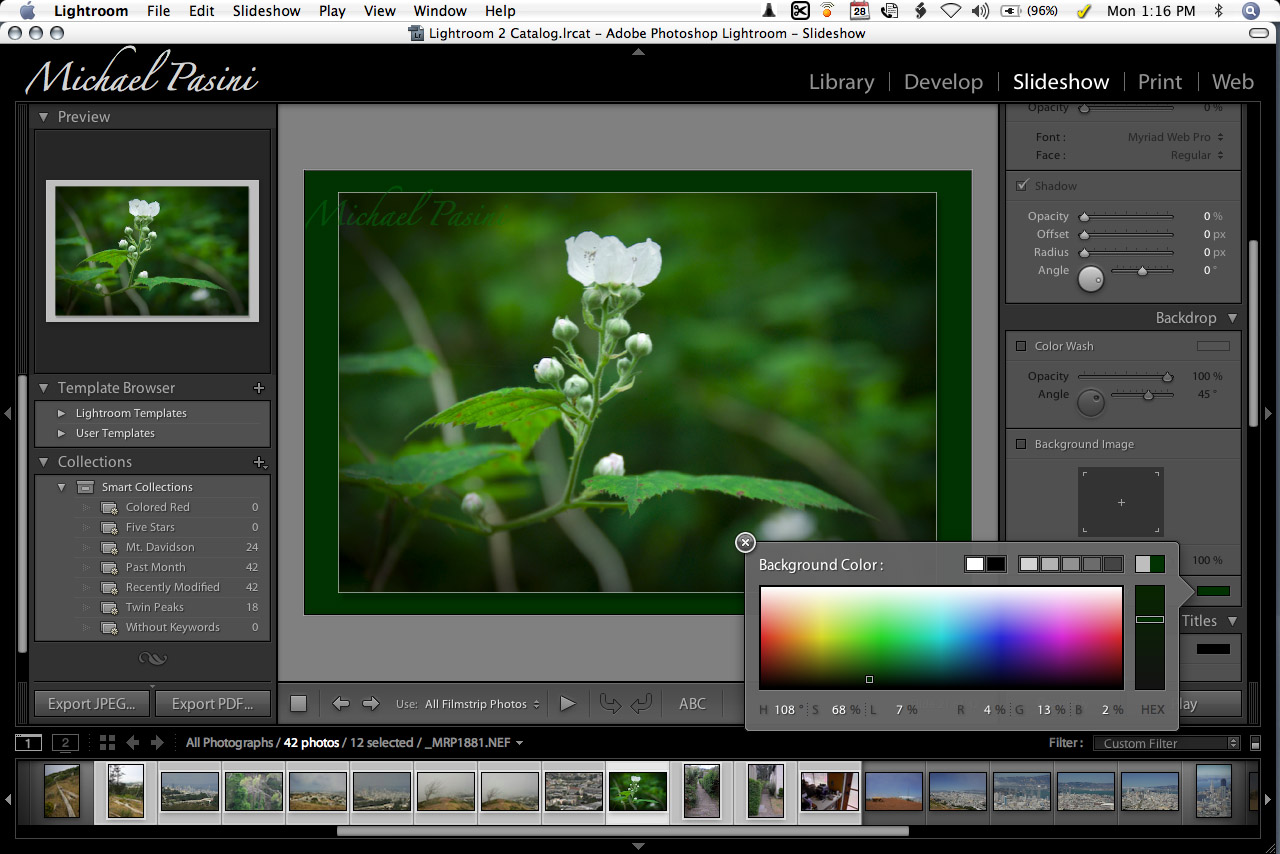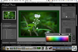 The new Color Picker lets you sample your image to select background colors for various output options like slide shows. Just click the color field to display the color picker and hold the mouse button down over the field before dragging the pointer to a spot on your image. The picker will show that color as the selection.