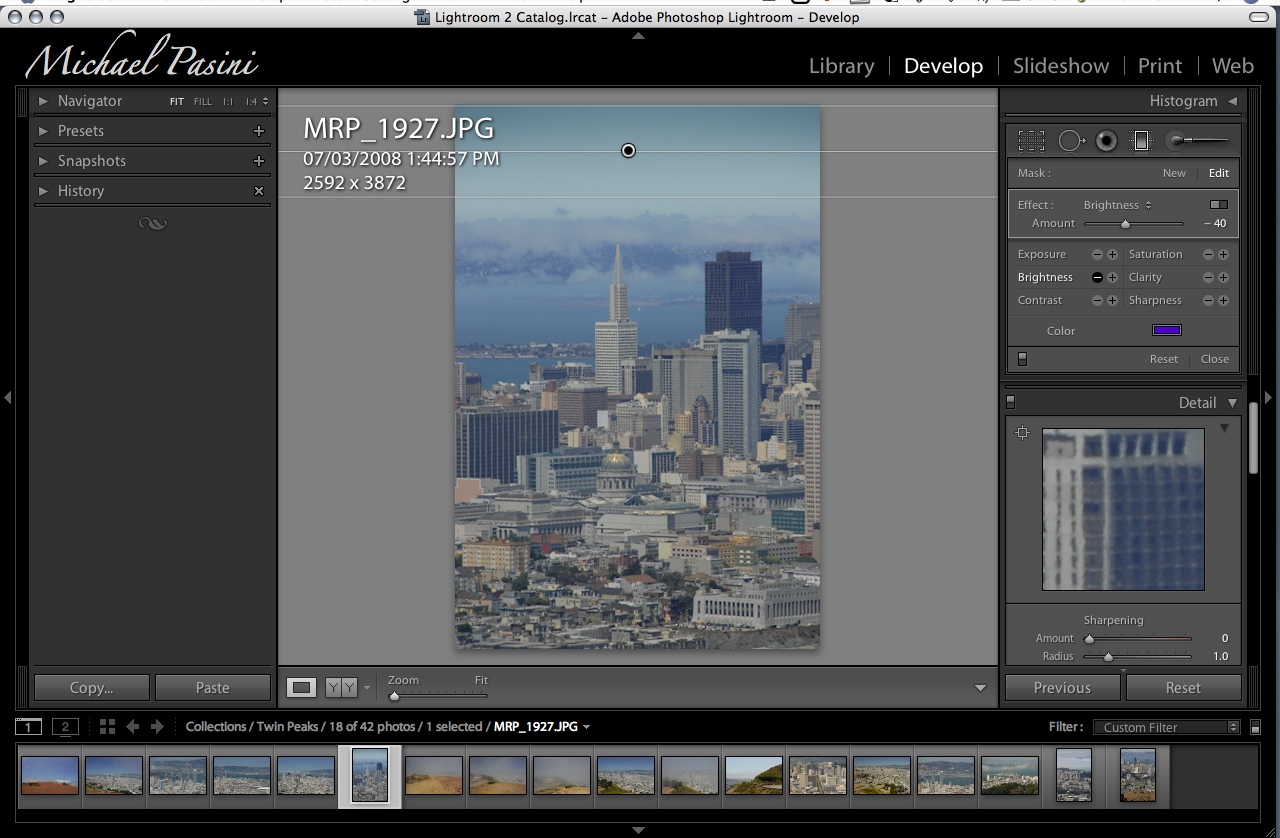 If the Library module changes are efficient, the Develop module's changes are productive. With the addition of local image correction tools, there's less reason to use an external editor in Lightroom 2. And the side benefit of that is the non-destructive nature of the new edits Lightroom 2 affords.