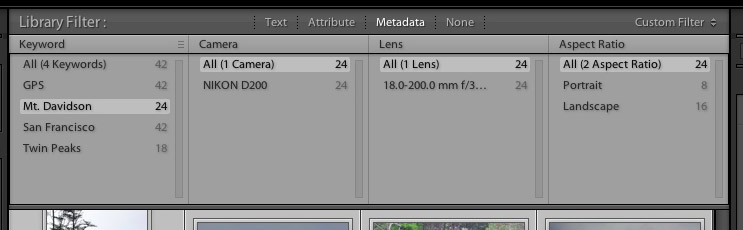 By default, Metadata provides four columns from each of which you can select any of 22 criteria to filter your collection. By default the panels are assigned to and display the Dates (including the Day name), Cameras, Lenses and Labels of the current selection. You can add or remove the columns by clicking at the right side of their label bars and you can select a different criteria by clicking on the criteria name, which pops up the whole list. That list includes new fields like GPS, Aspect Ratio and Develop Preset.