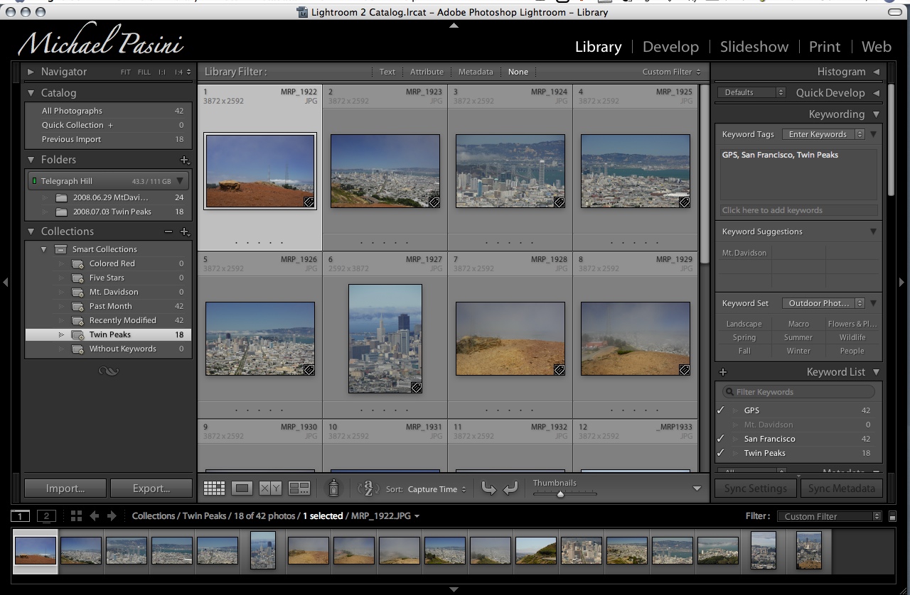 There's also a Keyword List from which you can quickly filter the selection based on keyword by clicking on the keyword in the list or entering it in a text box. Immediately, the Filter bar will display the keyword filter and the selected images will be displayed.