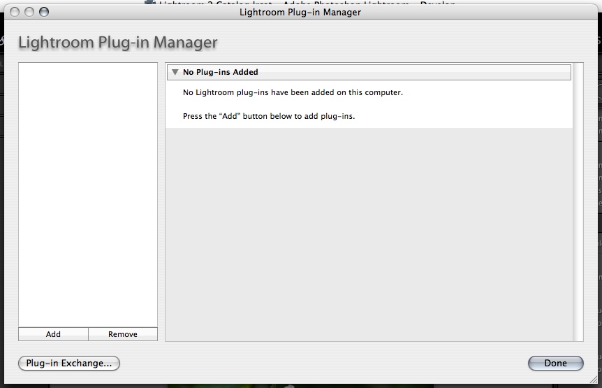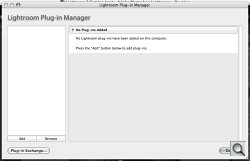 To manage what Adobe expects to be a wealth of new plug-ins, Lightroom 2 includes a Plug-In Manager. The Manager can load, remove and find new plug-ins with a button to go directly to the Lightroom Exchange.