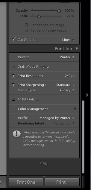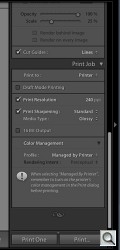 In the Print module, Print Sharpening can be set in the Print Job section to select Low, Standard or High options. You can also specify whether your media is Glossy or Matte.