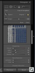 The Graduated Filter provides a gradient mask through which you can adjust Exposure, Brightness, Contrast, Saturation, Clarity (midtone contrast) or Sharpness. Holding the Shift key down as you draw the mask will restrict the angle. An Amount slider adjusts the effect.