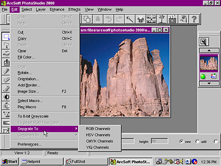 In addition to the normal cut and paste functions, the Edit menu lets you alter the image's rotation and orientation, add a border and change the image size. You can also select or play a macro object and separate the image into RGB, HSV, CMYK and YIQ channels. We're not going to get too technical here, but in addition to separating into channels, you can change the channel preferences. For instance, selecting Preferences from the Edit menu allows you to alter the RGB levels and change the background transparency (leave white or add a checker board for measuring placement) of an image.