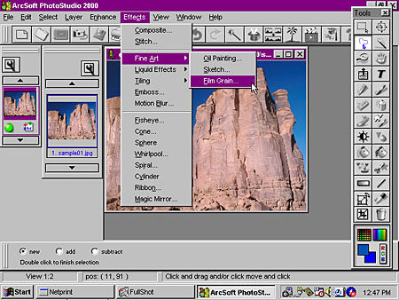 When you're ready to open an image, you can use the File menu to locate a specific image or browse through an album. The Album Manager feature lets you organize images into albums with specific names such as "Family Vacation" or "Julie's Wedding." Setting up an album is very simple, just click Open Album from the File menu. A window pops up with a pull down menu of available album titles. Scroll down to New Album and click. You've just created a new album. PhotoStudio comes with a sample album of images to play around with while learning the software. If you want to work on an image in an album, just scroll to the desired image in the album palette and double click it to open it in the work area. You can also take images straight from your digital camera or scanner (any TWAIN device) and pull them directly into PhotoStudio through the Acquire option on the File menu. There's also a Slide Show option which displays album images in a slide show format for easy review of all images.