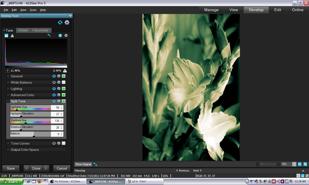 We did split toning first with the Split Tone panel. This took a little playing around, but that's the fun part. We picked a highlight color (yellow) and a shadow color (green) and then moved the highlight saturation and shadow separation slides up until we could see the color in the image. We had to adjust the balance a bit so they both played well in the image but after we did that, we liked what we saw. So we saved a copy as JPEG.