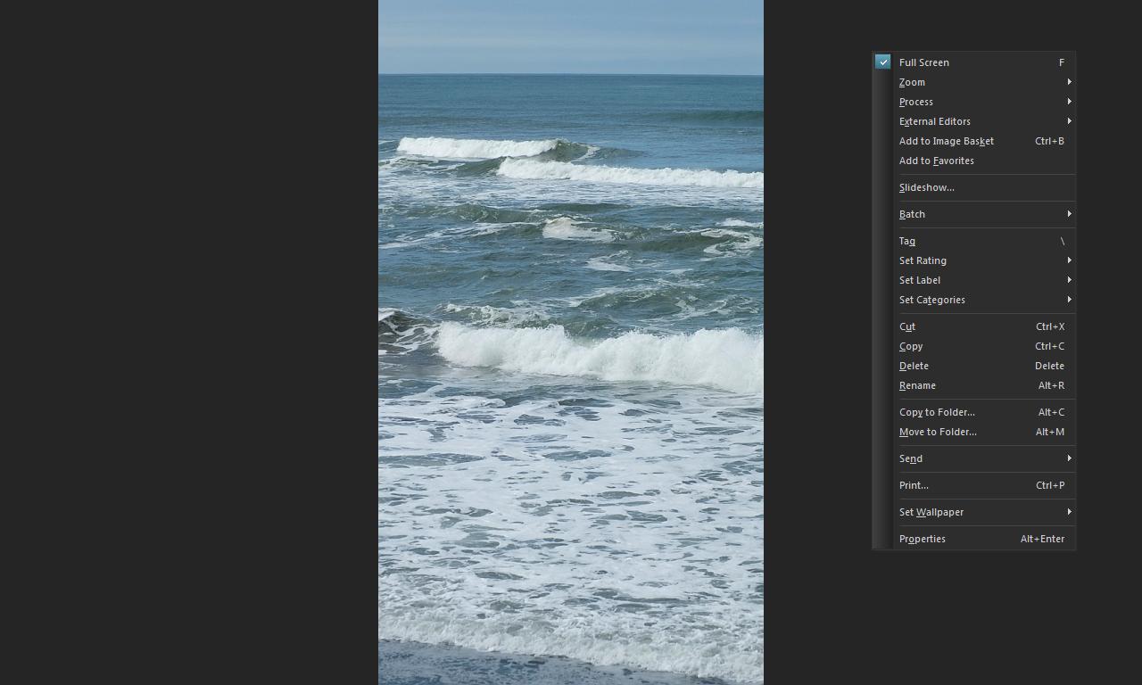 You can wipe all that off the screen, though, in Full Screen mode, which just shows the image itself. Pressing the F key toggles you back out or you can use the right-button menu to exit Full Screen mode.