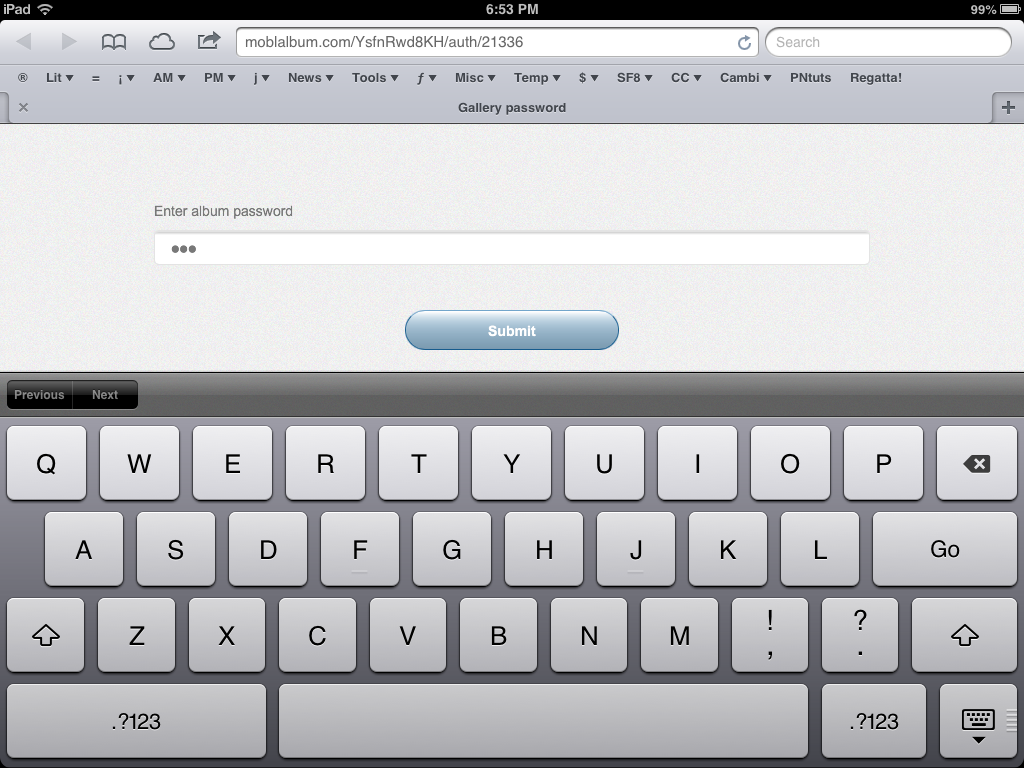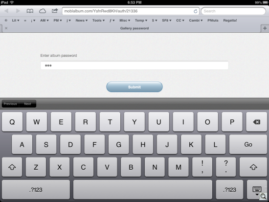 Viewing. We checked our album in our Web browser, since that's where we were. Then we took a look at it on an iPad. You can see our album here: http://moblalbum.com/YsfnRwd8KH/gallery/21336 with the password "honey." Try it on any device.