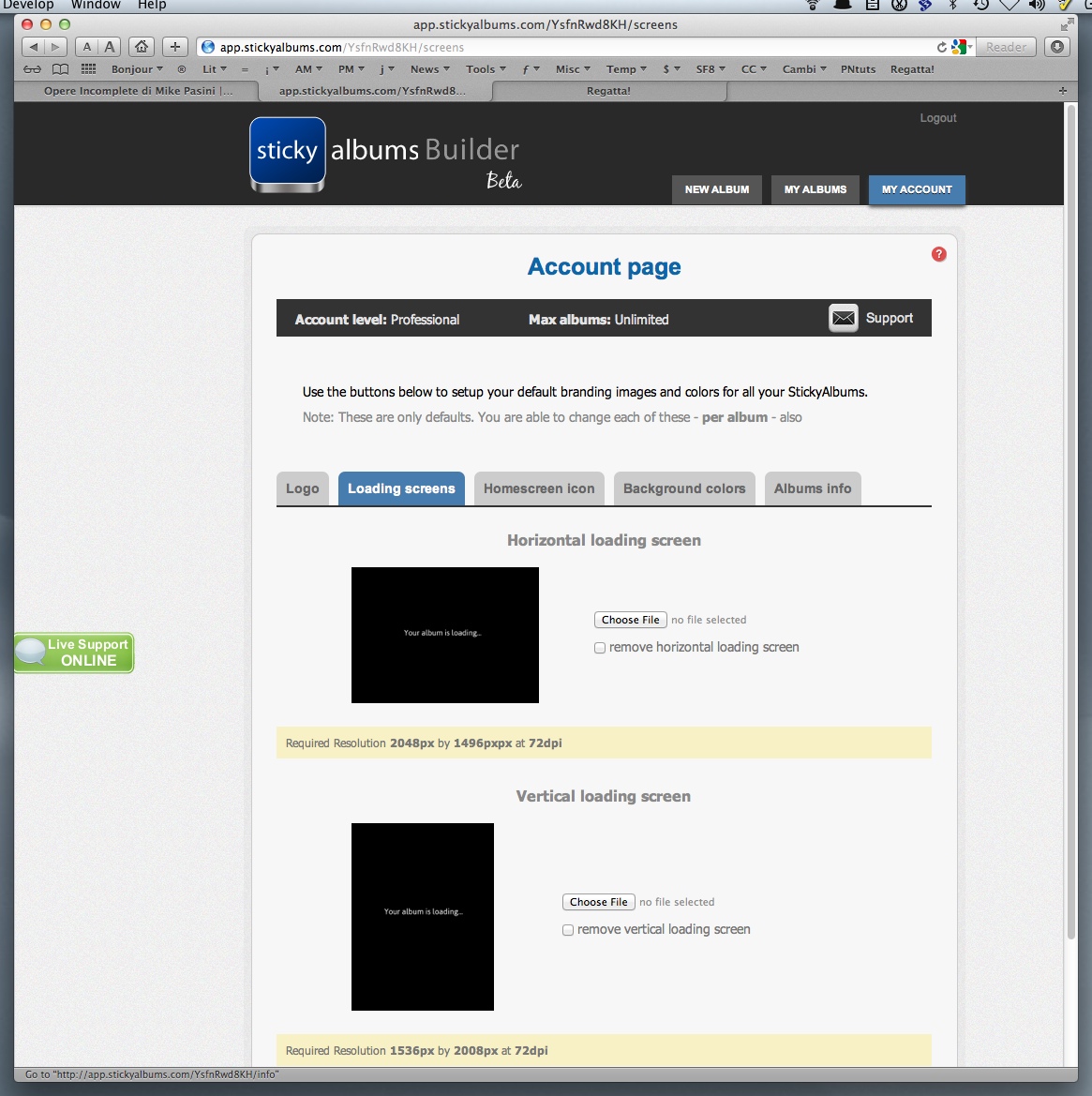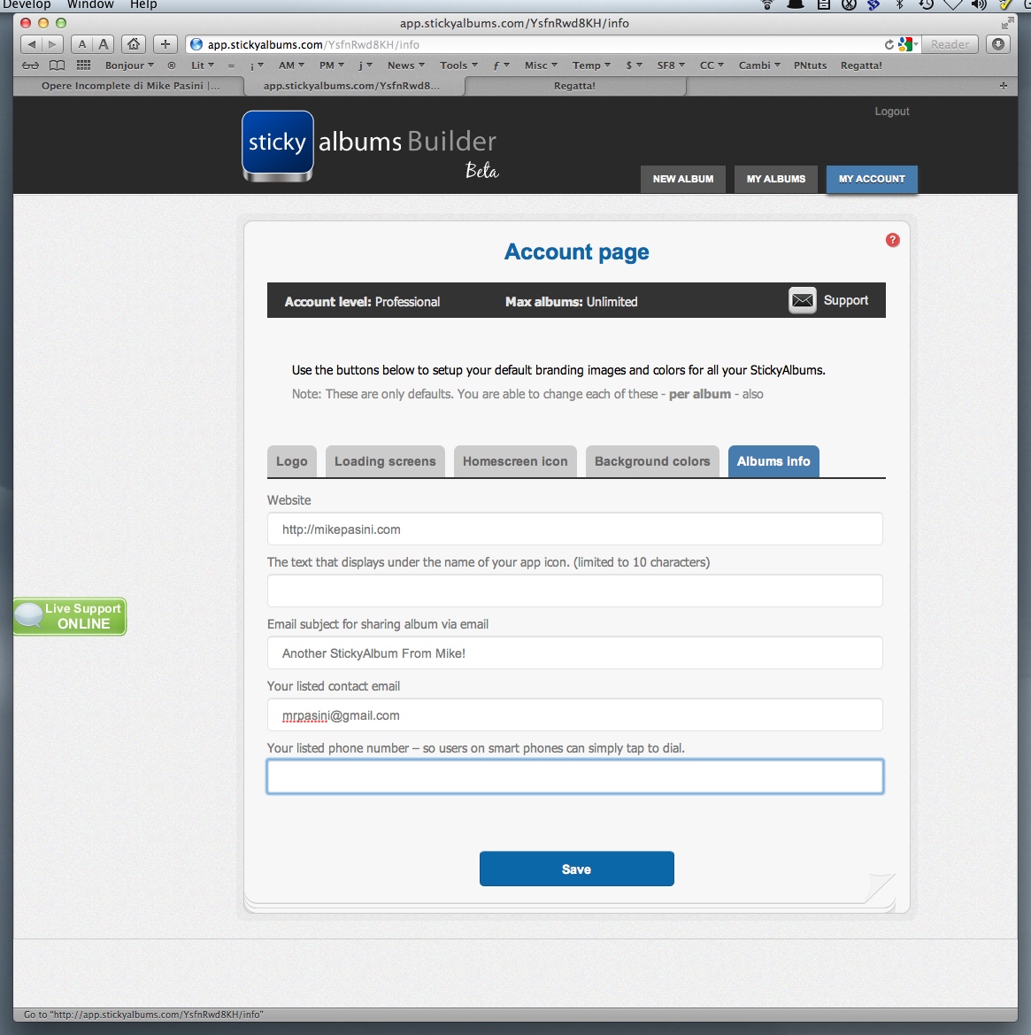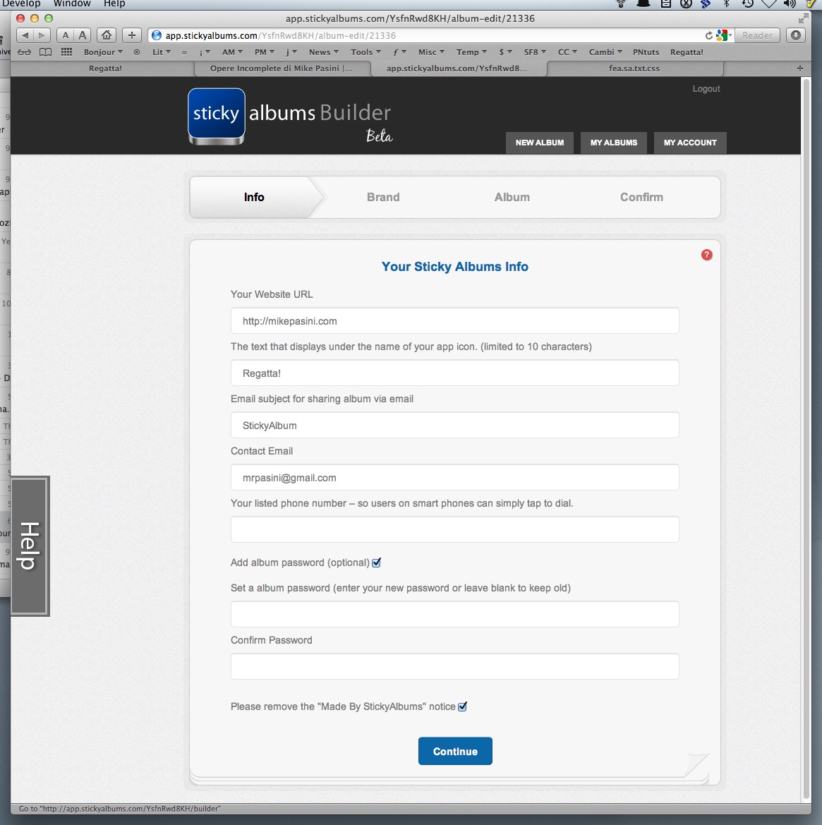 Info got all the required data from us in one simple form: the URL to your Web site, the label for the app icon, an email subject line, your email address, a phone number, an optional album password and, for the Professional option, a checkbox to remove the "Made by StickyAlbums" notice.