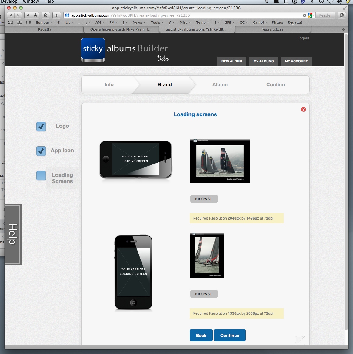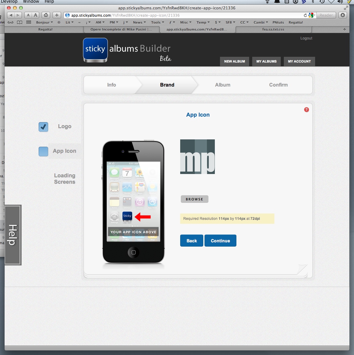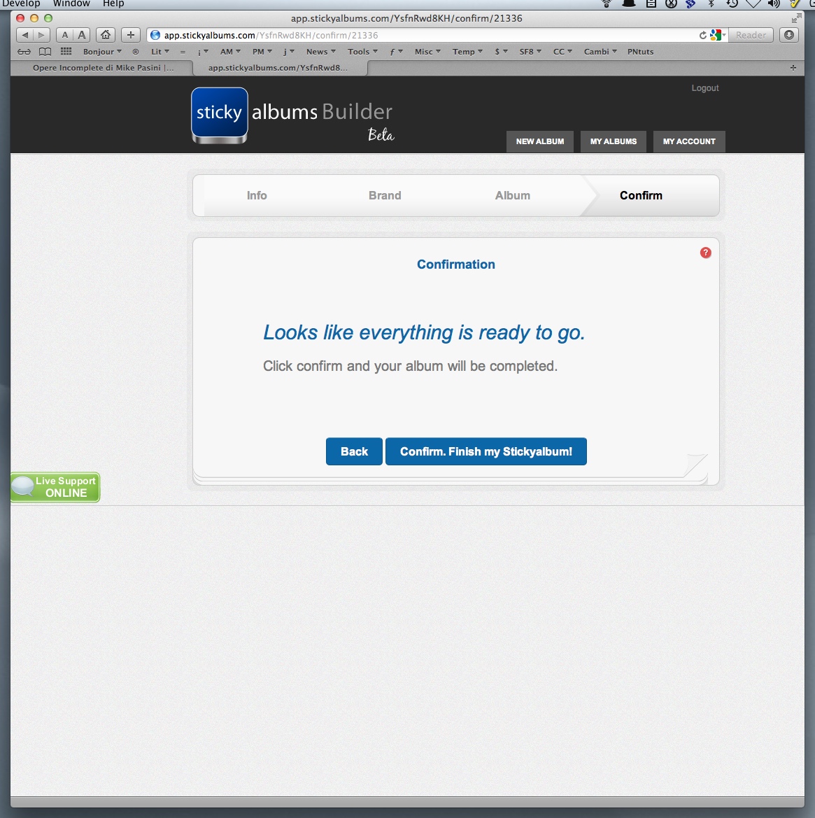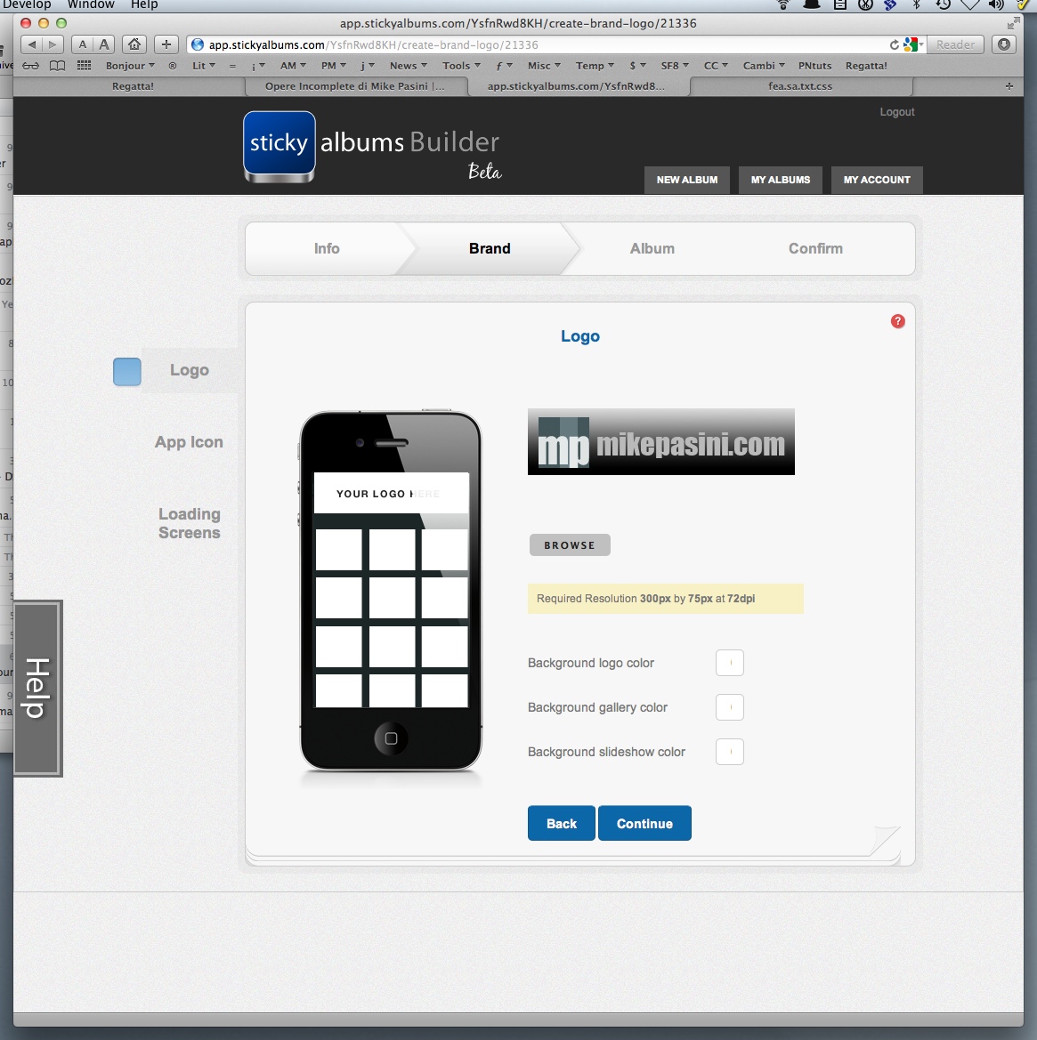 Builder. Then we were ready for Builder. There are four steps to the process: Info, Brand, Album and Confirmation.