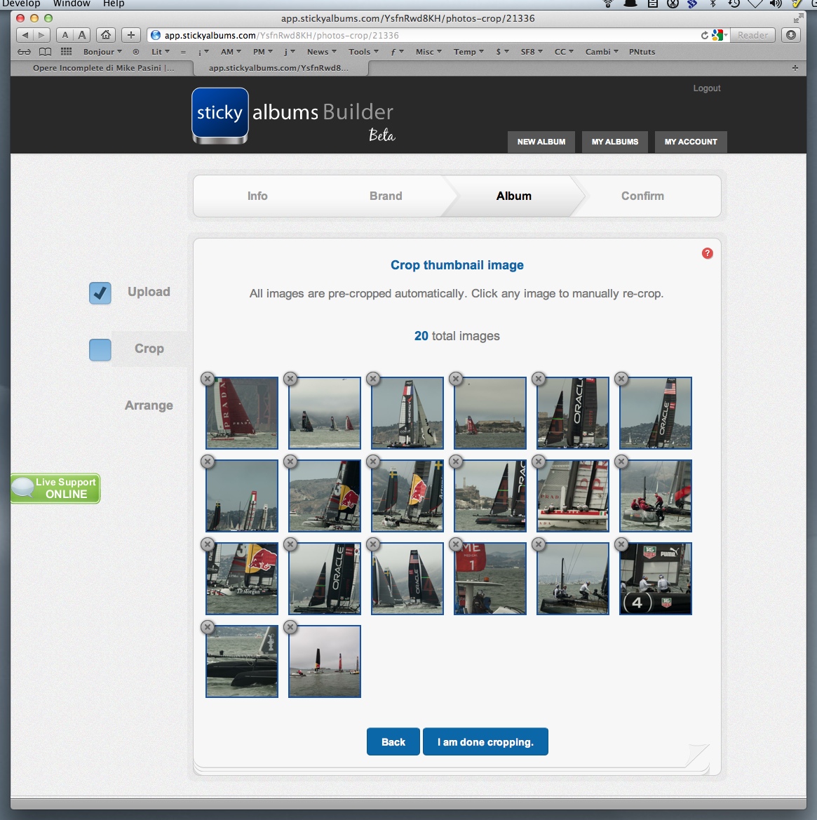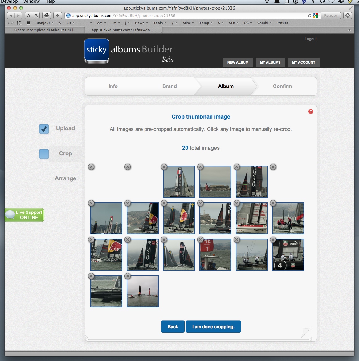 In the Album section, we selected all 20 of our images and uploaded them. Then we checked the thumbnail crops and the arrangement.