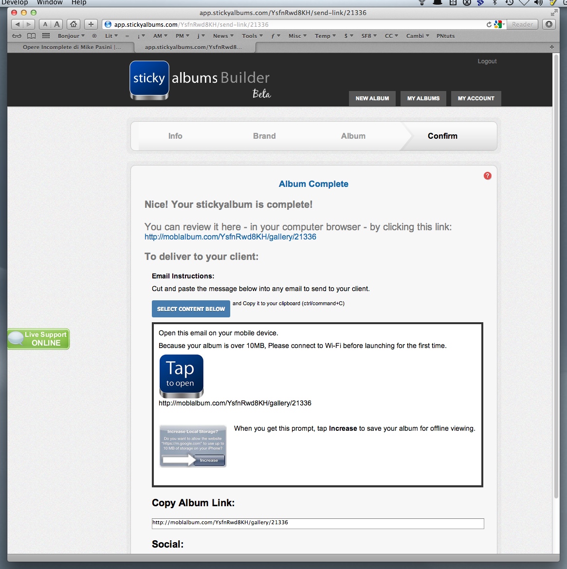 When the album is built (don't blink), Builder displays a link to it as well as a sample email you can send your client.