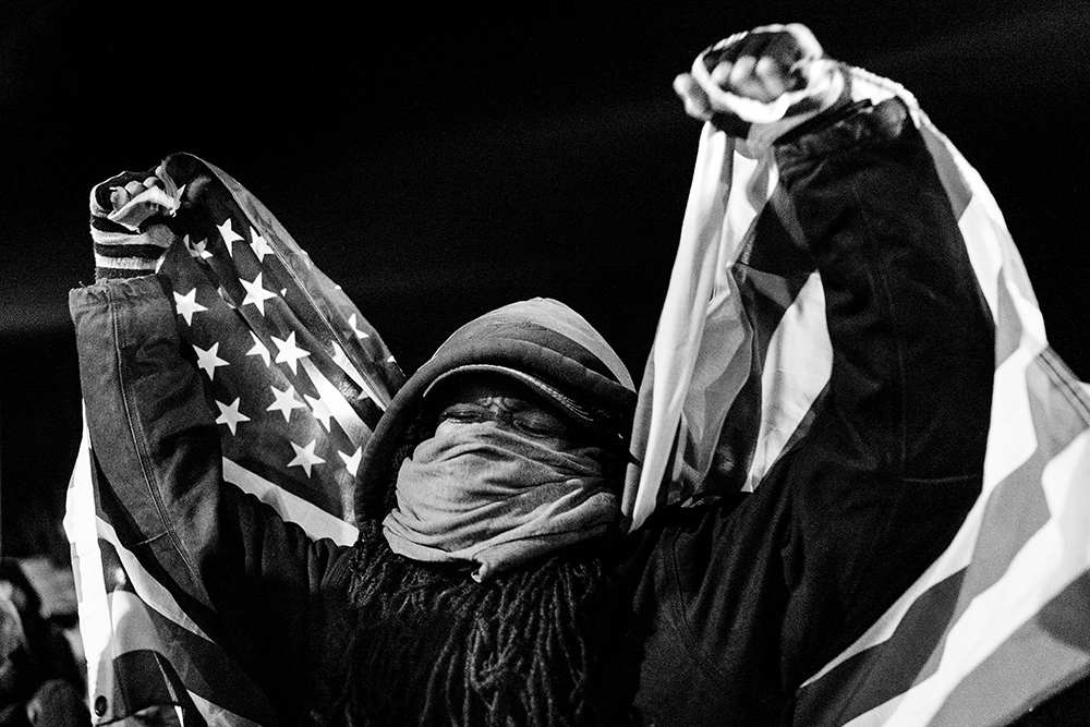 A protester holds the American flag aloft during a protest outside the Ferguson, Missouri, police department the night after riots following the announcement of a grand jury's decision not to indict white police officer Darren Wilson in the death of unarmed black teen Michael Brown. Photographed with a Sony RX1R at ISO 50 with an f/4.0 aperture and 1/640 second shutter speed. Photo © Benjamin Lowy / Reportage by Getty Images.