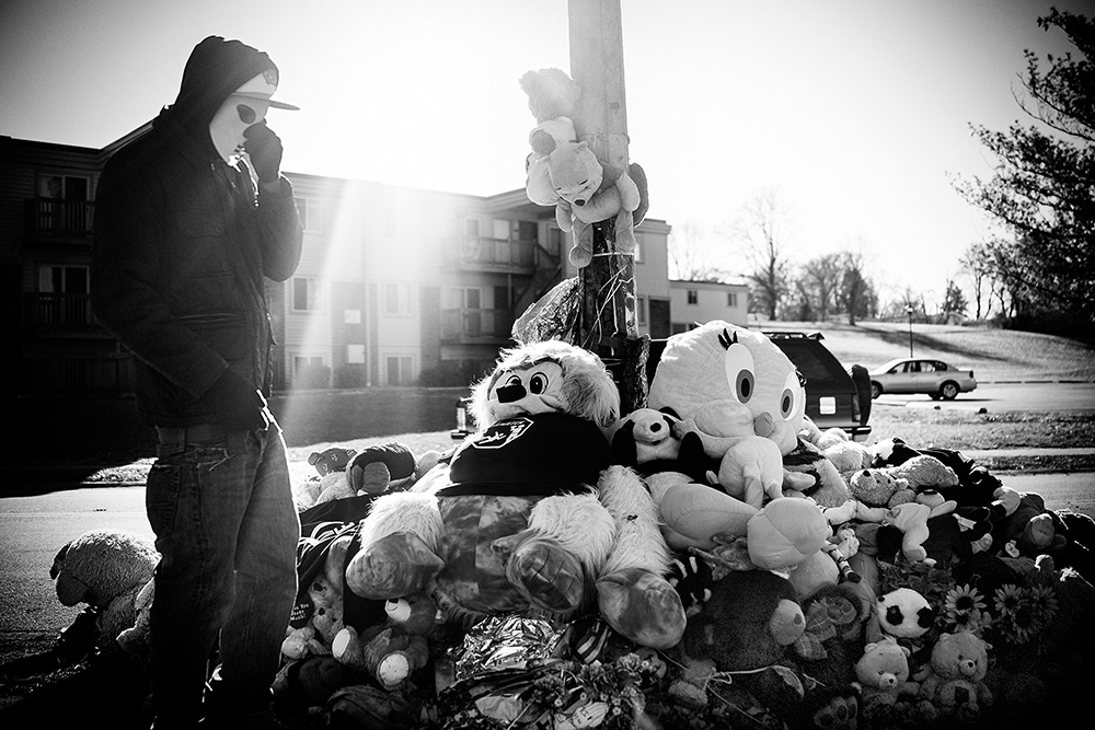 A masked mourner and caretaker spends time at the growing memorial for slain black teen Michael Brown in Ferguson, Missouri. Photographed with a Sony RX1R at ISO 50 with an f/2.0 aperture and 1/1250 second shutter speed. Photo © Benjamin Lowy / Reportage by Getty Images.