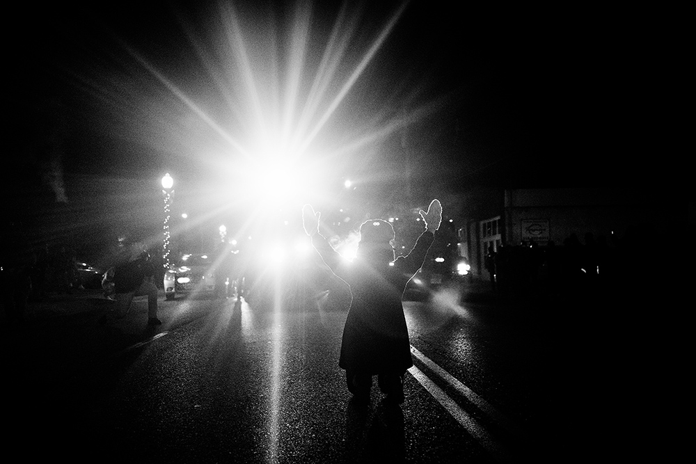 A white protester, ignoring the pleas of her friends, stands in the street, her hands raised daring the police to arrest her, following a violent turn of events as angry protesters touched an unmanned police car parked outside the Ferguson, Missouri, city hall. Photographed with a Sony RX1R at ISO 2500 with an f/2.0 aperture and 1/1600 second shutter speed. Photo © Benjamin Lowy / Reportage by Getty Images.
