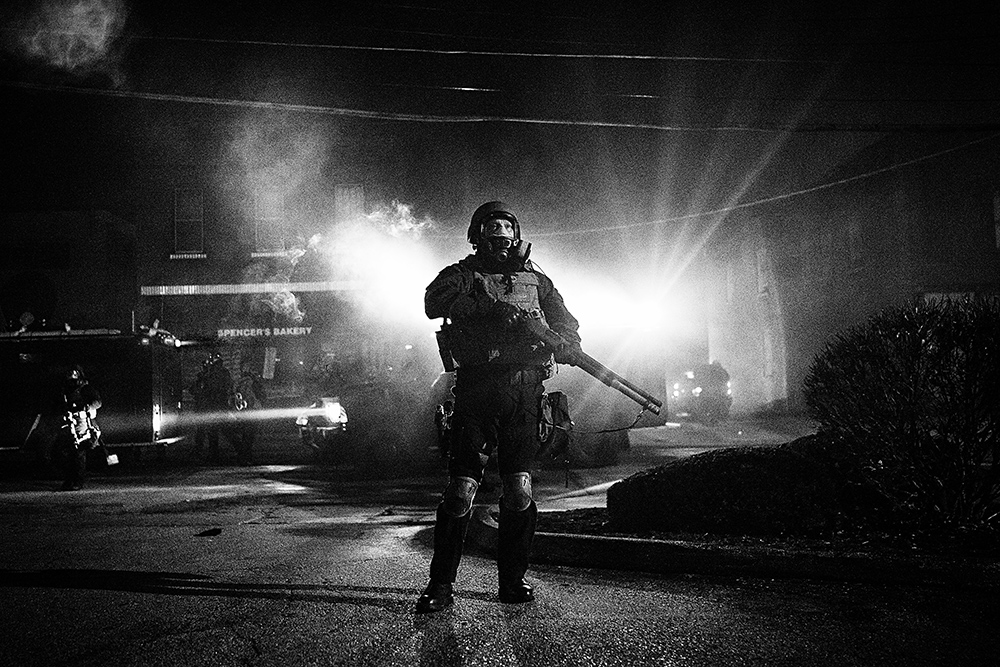 A riot police officer wades into a cloud of tear gas as numerous police units respond to the destruction of a police car parked outside the City Hall in Ferguson, Missouri. Photographed with a Sony RX1R at ISO 2500 with an f/2.0 aperture and 1/250 second shutter speed. Photo © Benjamin Lowy / Reportage by Getty Images.