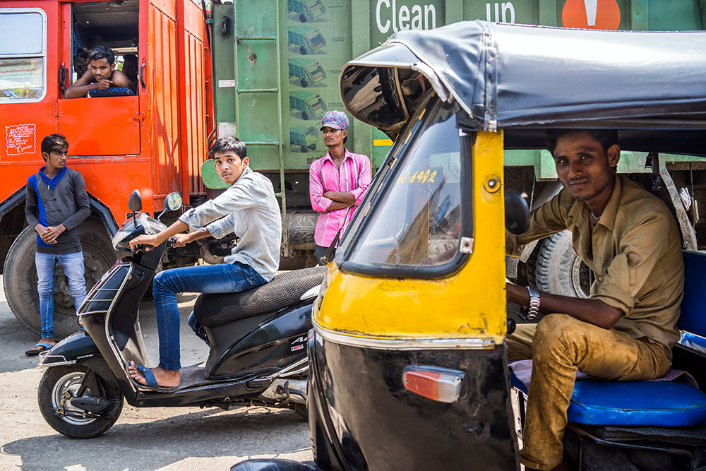 Residents and passersby watch Ben Lowy in Govandi, a slum that is arguably the poorest part of Mumbai, India. The population is estimated to be 800,000 to 1 million people crammed into the outskirts of a garbage dump and lacking basic sanitation. But even there, Lowy was welcomed and found himself the subject of innocent curiosity. "My tattoos are a big hit in India," says Lowy," and apparently so is my bald white head. Indians from all walks of life, rich and poor, are always taking selfies with me." Photographed with a Sony RX1R at ISO 640 with an f/5.0 aperture and 1/800 second shutter speed. Photo © Benjamin Lowy / Reportage by Getty Images.