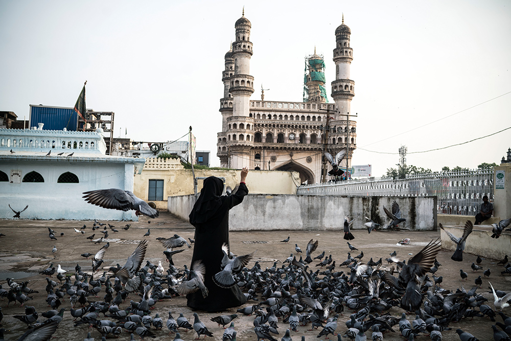 A Muslim woman feeds hundreds of pigeons at the famous Makkah Masjid in Hyderabad, India. Photographed with a Sony a7R II and Sony FE 35mm f/1.4 ZA Zeiss Distagon T* lens at ISO 400 with an f/4.0 aperture and 1/800 second shutter speed. Photo © Benjamin Lowy / Reportage by Getty Images.