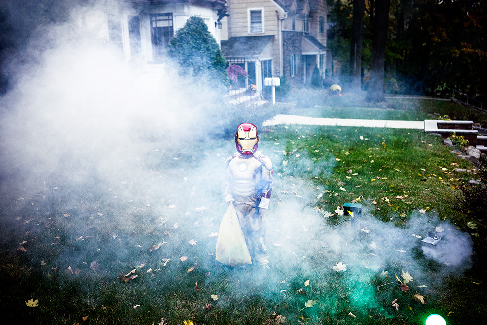 Mateo as Halloween-smoke Iron Man with candy bag; Maplewood, New Jersey. Photographed with a Sony a7R and Sony FE 35mm f/1.4 ZA Zeiss Distagon T* lens at ISO 1000 with an f/3.2 aperture and 1/80 second shutter speed. Photo © Benjamin Lowy / Reportage by Getty Images.