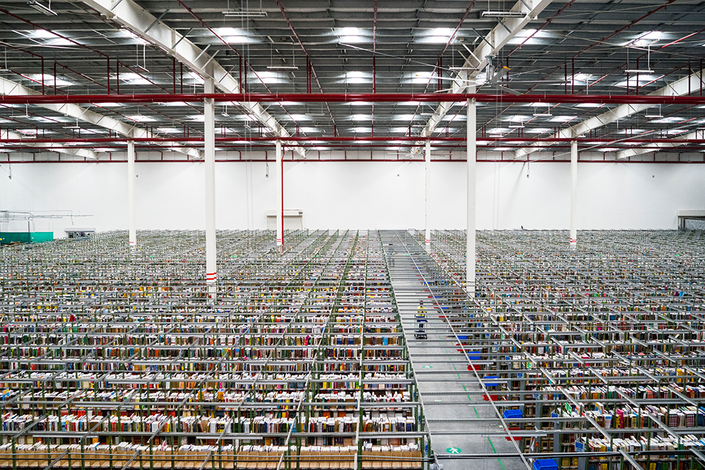 Row after row of every conceivable product, stored in one of the Amazon.com "Fulfillment Centers" outside of Hyderabad, India. Photographed with a Sony a7R and Sony FE 35mm f/1.4 ZA Zeiss Distagon T* lens at ISO 4000 with an f/4.0 aperture and 1/400 second shutter speed. Photo © Benjamin Lowy / Reportage by Getty Images.