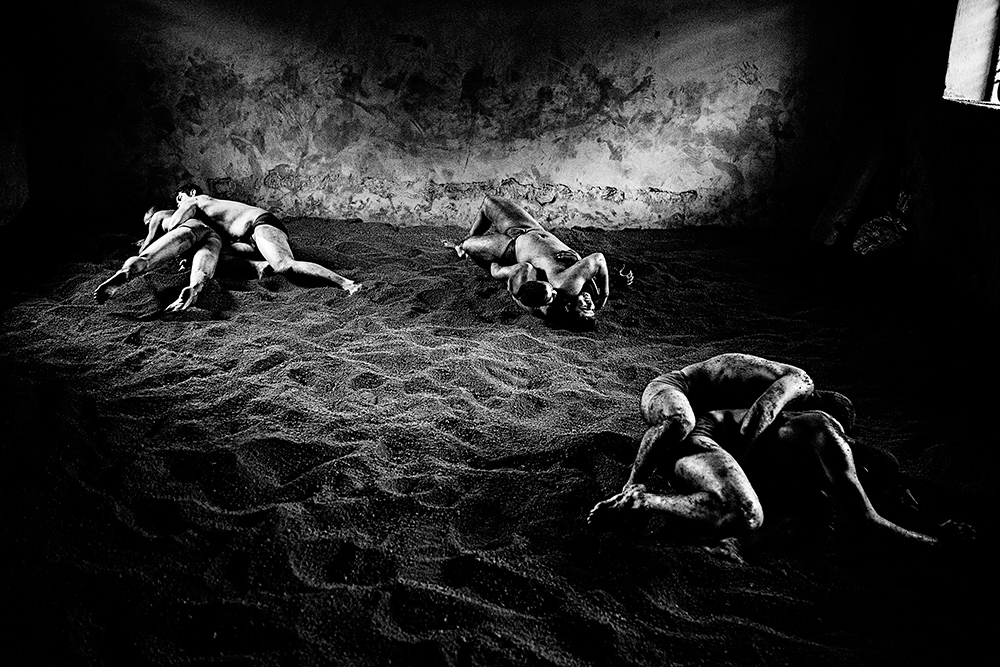 Indian Kushti wrestlers at daily practice in a talim (a wrestling center) in Kolhapur, India. Photographed with a Sony a7R II and Sony 70-200mm f/2.8 OSS lens at ISO 2500 with an f/2.8 aperture and 1/320 second shutter speed. Photo © Benjamin Lowy / Reportage by Getty Images.