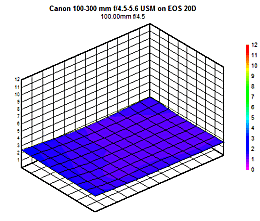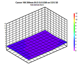 Distortion isn't much of a problem when the 100-300mm ƒ/4.5-5.6 is mounted on a subframe sensor body; a very slight pincushion (squeeze) type distortion in the center, and a slight barrel distortion on the edges, not exceeding 0.25%. This performance is echoed on a full-frame body, though slightly more prominent owing to the larger frame size. In that case, distortion is minimal when set to 100mm, but by 300mm there is 0.5% barrel distortion in the corners and 0.25% pincushion in the center.