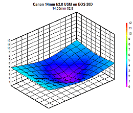 Surprisingly, the Distortion performance for the Canon 14mm lens is essentially the same on both sub-frame and full-frame bodies. While these values represent distortion that is perceptible to the average viewer, they are probably about average for lenses of this short focal length. The Distortion performance by the Canon 14mm f/2.8 receives an "Average" rating.