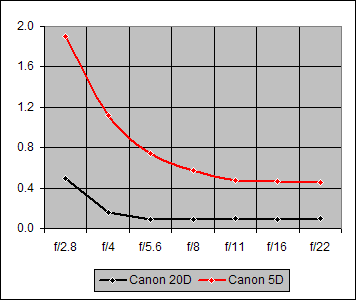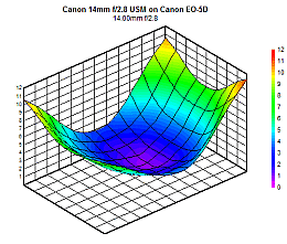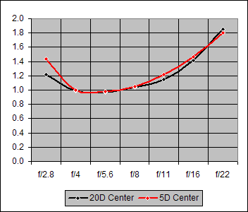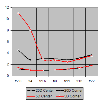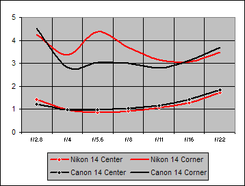 Figure 1. Center Sharpness for Canon 14mm f/2.8L on Canon 20D and Canon 5D