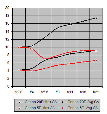 Figure 3. Maximum and Average Chromatic Aberration for Canon 14mm f/2.8L on 20D and 5D
