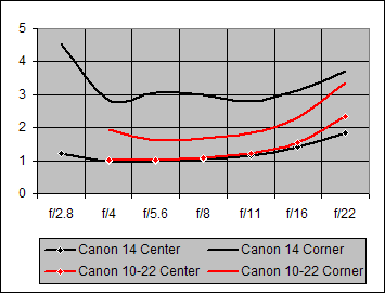 Again, the Center Sharpness performances by the Canon 14mm and its competitor, the Canon 10-22mm are essentially identical. And again, the competitor's Corner Sharpness performance is significantly better by about one Blur Unit across the aperture spectrum.