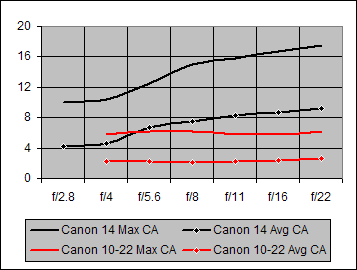 CA performance by the Canon 10-22mm lens is significantly better than that of the very poor CA exhibited by the Canon 14mm f/2.8.