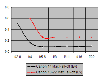 Over the f/4-22 aperture range where the Canon 14mm and Tokina12-24mm @ 15mm lenses can be compared, these two lenses have essentially identical Shading performances.