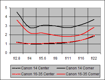Figure 8. Center and Corner Sharpness for Canon 14mm and Canon 16-35mm @ 16mm