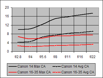 It is probably not surprising that the Canon 16-35mm f/2.8L significantly betters the Canon 14mm f/2.8L in the Chromatic Aberration tests. Again, the Average CA performance of the Canon 14mm is about equal to the Maximum CA performance of its competitor, in this case the Canon 16-35mm.