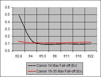 The Shading performances by the Canon 14mm and the Canon 16-35mm lenses are essentially identical except at f/2.8, where the "wide open" shading by the Canon 14mm is significantly worse than that of the Canon 16-35mm.