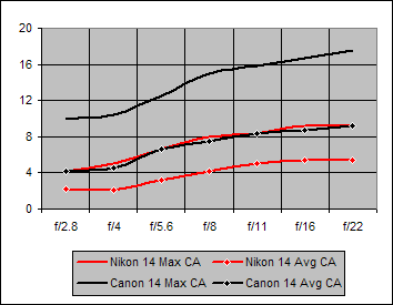 Figure 6 reveals that the Nikon 14mm f/2.8 clearly outperforms the Canon 14mm f/2.8 in the Chromatic Aberration tests. By chance, the Average CA performance by the Canon is almost identical to the Maximum CA performance by the Nikon.