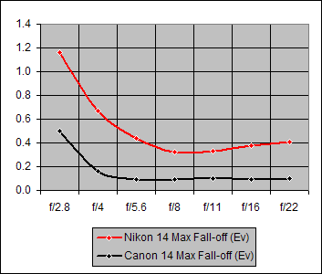 The Shading graphs of Figure 7 indicate that the Nikon 14mm f/2.8 values are about three times (worse) than those of the Canon.