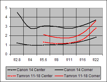 While the Tamron 11-18mm @ 15mm does not reach down to f/2.8 or even f/4, its Center Sharpness performance over the f/5.6-f/16 aperture range is very nearly the same as that of the Canon 14mm. At f/22, the Tamron is noticeably less sharp than the Canon. Corner Sharpness with the Tamron lens is significantly better than that of the Canon.