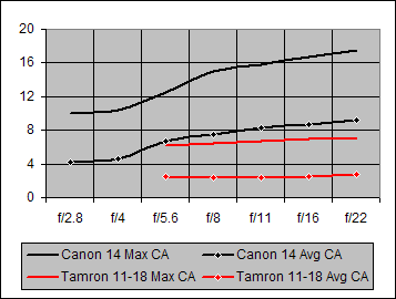 Once again, the Canon 14mm f/2.8L is completely outperformed in Chromatic Aberration performance by yet another lens, the Tamron 11-18mm f/4.5-5.6.